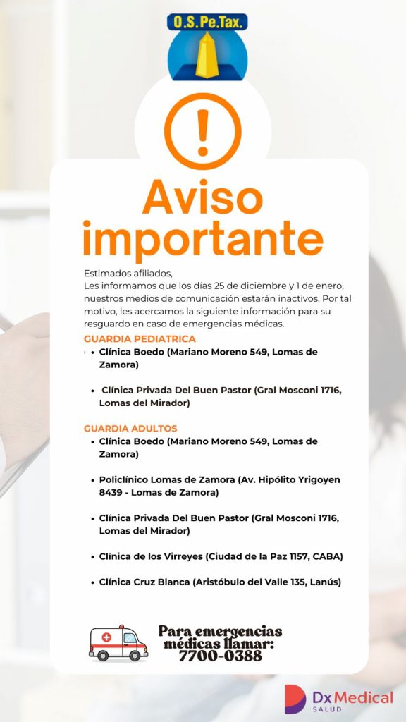 Información importante por guardias Estimados afiliados, Les informamos que los días 25.12.25 y 01.01.26, nuestro medios de comunicación estarán inactivos. Por tal motivo ...
